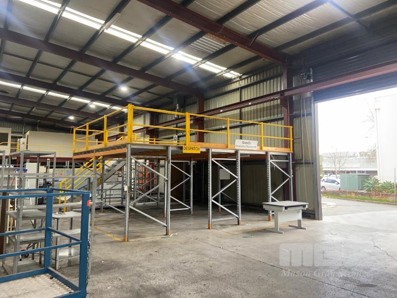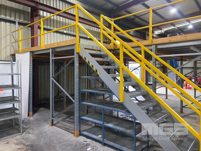 MEZZANINE FLOOR 6.9 mtrs L X 6.4 mtrs D X 2,4 mtrs h . COLBY UPRIGHTS AND CROSS BEAMS , WITH STAIRCASE, SAFTEY RAILS , FORKLIFT ACCESS GATE, PARTICAL BOARD FLOOR . FLURO LIGHTS UNDER NEATH.