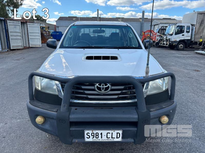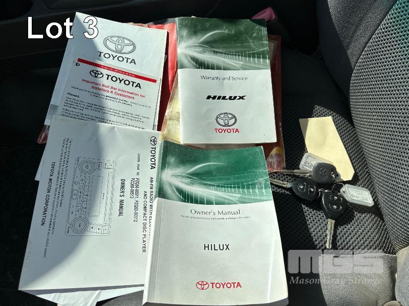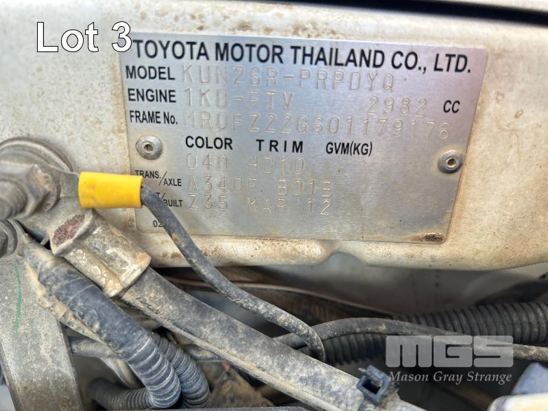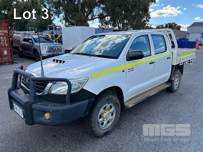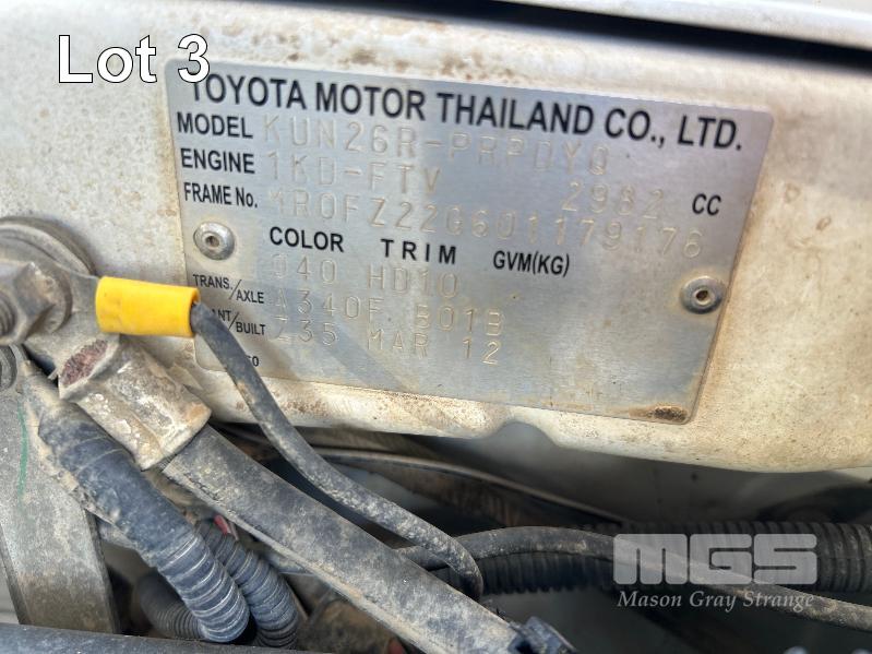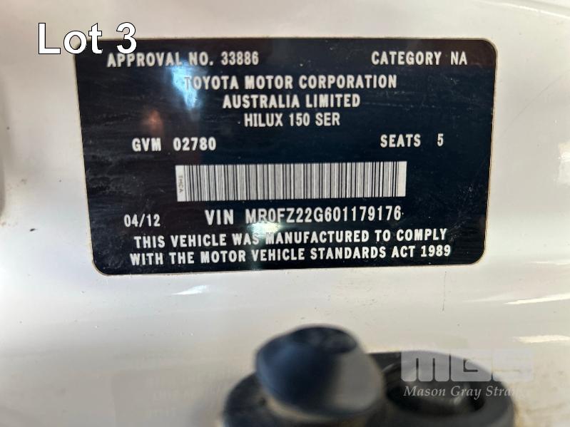 2012 TOYOTA HILUX KUN26R, 150 SERIES, DUAL CAB, TRAY TOP, 4x4 REG: S2981 CLD (SA) VIN: MR0FZ22G601179176 ENG: 1KD5700805 ODO: 112,041kms SHOWING 3.0 LITRE TURBO DIESEL, AUTOMATIC TRANSMISSION, WHITE DUCO, 4 DOORS, 5 SEAT, 4x4 ABS, AIR BAG, AIR CON, BULL BAR, CARGO BARRIER, CD PLAYER, CENTRAL LOCKING, CRUISE CONTROL, DECALS, IMMOBILISER, POWER STEERING, POWER WINDOWS, SIDE STEP, SPARE WHEEL, STEEL TRAY, TOW BAR, 2 WAY RADIO KEY #14 (WITH PAPERS, WITH 3 KEY/S, WITH OWNER'S MANUAL, WITH SERVICE BOOKS)