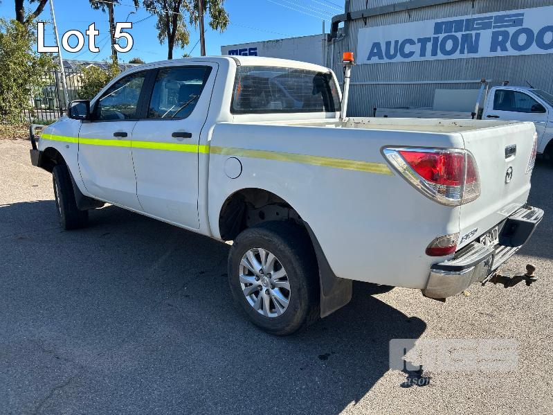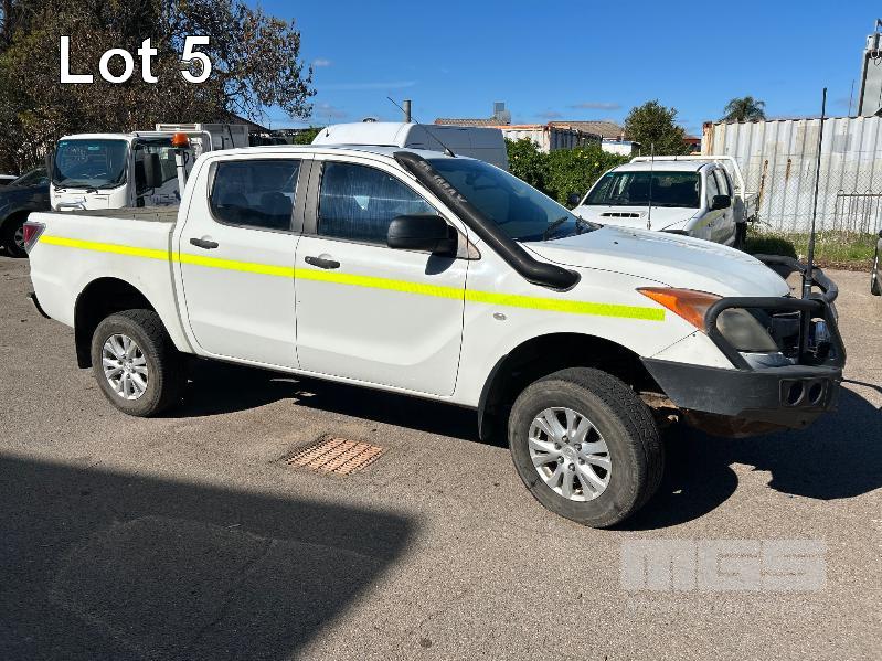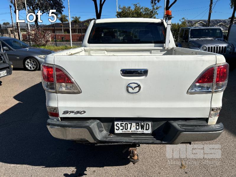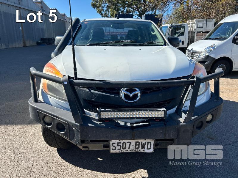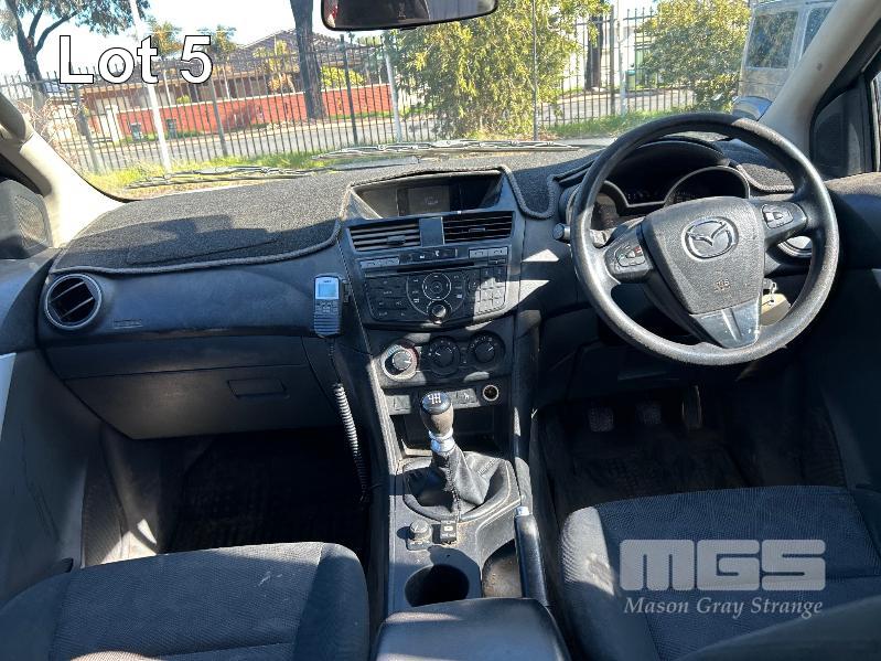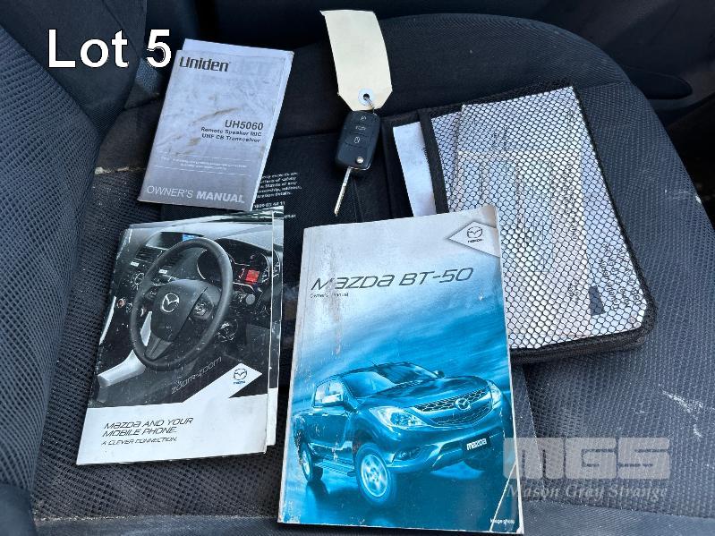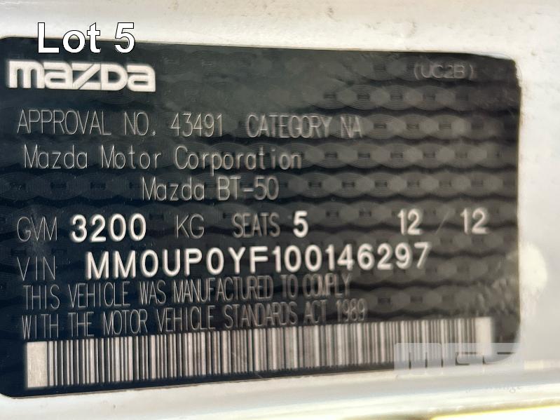 2012 MAZDA BT-50 DUAL CAB UTE 4x4 REG: S507 BWD (SA) (EXPIRED) VIN: MM0UP0YF100146297 ENG: P5AT1071834 ODO: 281,183kms SHOWING 5 CYLINDER TURBO DIESEL, 6 SPEED MANUAL TRANSMISSION, WHITE DUCO, 4 DOORS, 5 SEAT, 4x4 ABS, AIR BAG, AIR CON, ALLOY WHEELS, BLUETOOTH, BULL BAR, CD PLAYER, CENTRAL LOCKING, CRUISE CONTROL, DECALS, IMMOBILISER, POWER STEERING, POWER WINDOWS, SPARE WHEEL, TOW BAR, TRACTION CONTROL, SNORKEL AIR INTAKE 2 WAY RADIO KEY #18 (WITH PAPERS, WITH 1 KEY/S, WITH OWNER'S MANUAL)