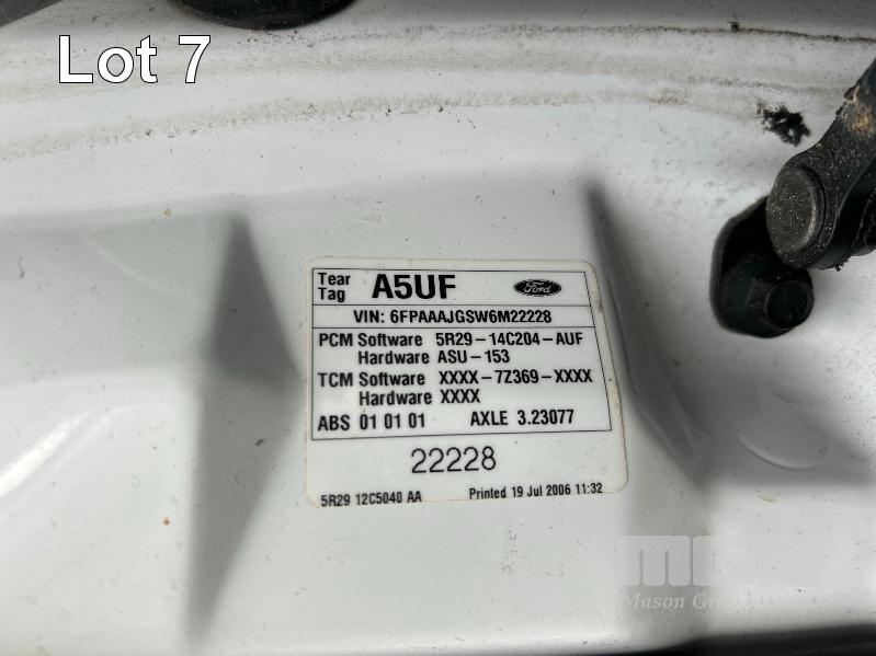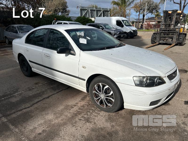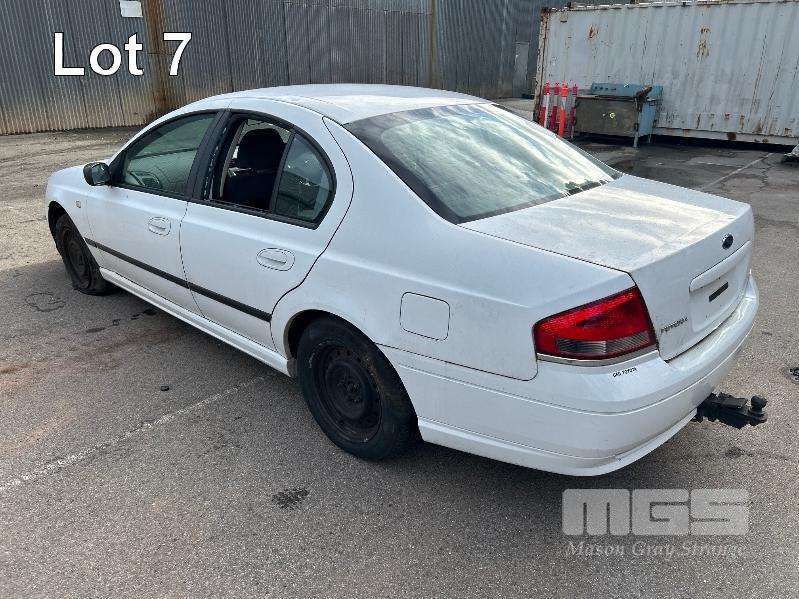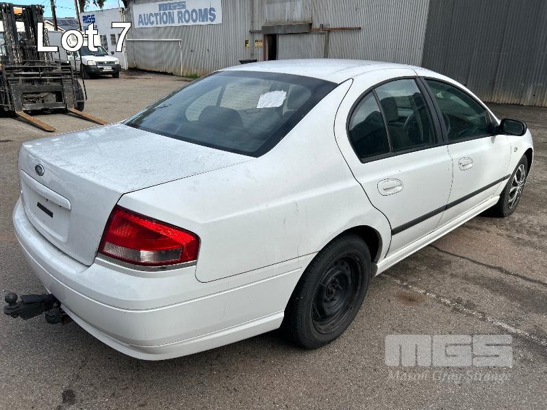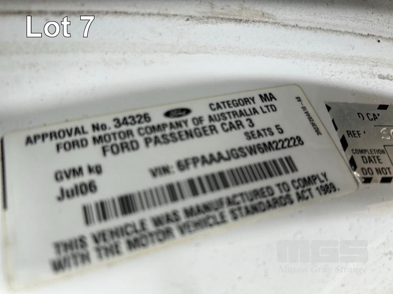 2006 FORD FUTURA BF XT SEDAN REG: NO PLATES (SA) VIN: 6FPAAAJGSW6M2228 ENG: JGSW6M2228 ODO: 204,593 kms INDICATED 4.0 LITRE, LPG, AUTO, WHITE DUCO, 4 DOORS, 5 SEAT, AIR BAG, AIR CON, CD PLAYER, CENTRAL LOCKING, CRUISE CONTROL, POWER STEERING, CONDITION UNKNOWN KEY #35 (NO PAPERS, WITH 1 KEY/S, NO OWNER'S MANUAL, NO SERVICE BOOKS)