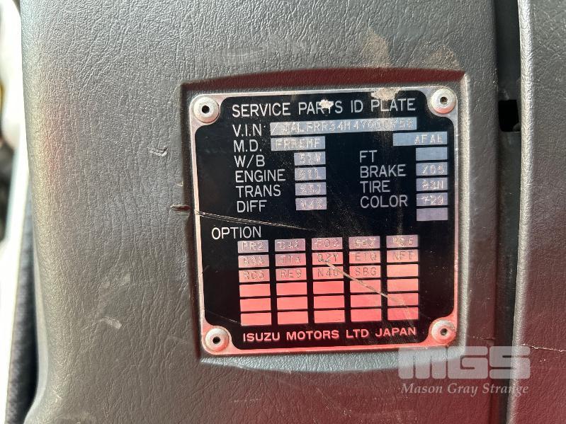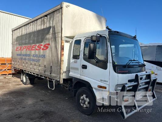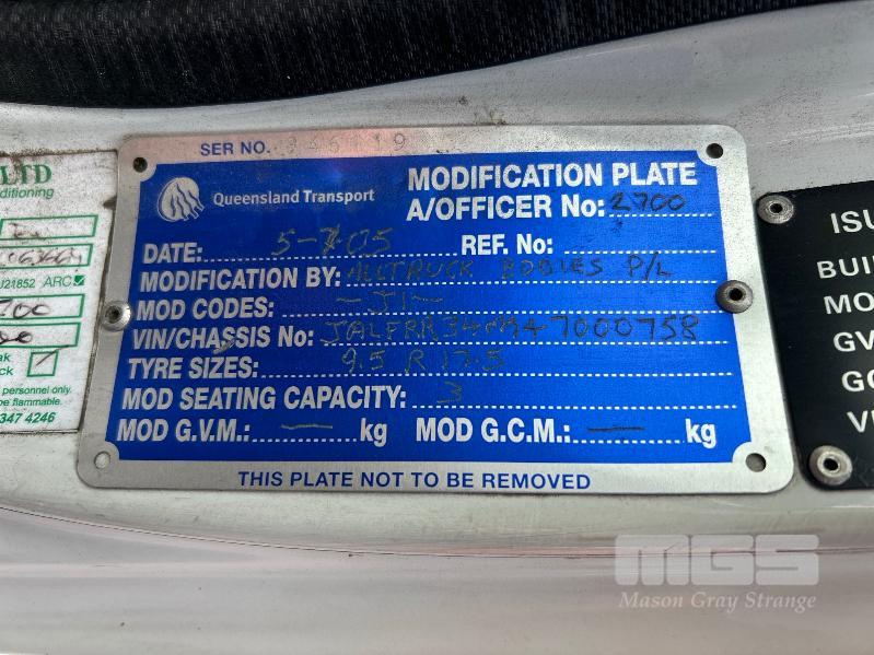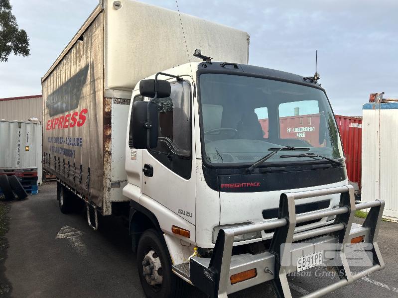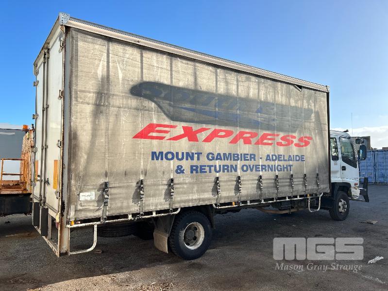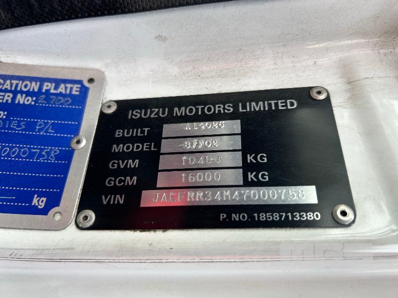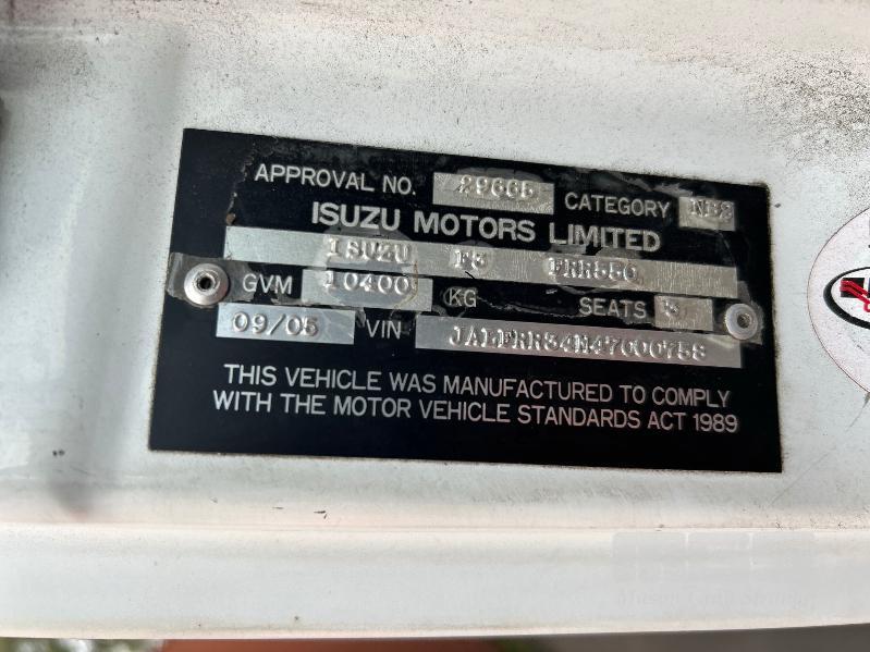 2005 ISUZU F3 FRR550 525 LONG FREIGHTPACK, SINGLE CAB TAUTLINER 4x2 REG: SB 91 PB (SA) VIN: JALFRR34N47000758 ODO: 888,020kms SHOWING GVM: 10,400kg GCM: 16,000kg SITEC 220 6 CYLINDER TURBO DIESEL, 6 SPEED MANUAL, WHITE DUCO, 2 DOORS, 3 SEAT, AIR CON, BULL BAR, STEEL RIMS, TAUTLINER BODY SIZE: 6400 x 2500mm DOUBLE REAR DOORS, AIR DAM, FULL SET OF GALV STEEL GATES, 9.5 R17.5 TYRES SPARE WHEEL. KEY #16 (WITH PAPERS, WITH 1 KEY/S)