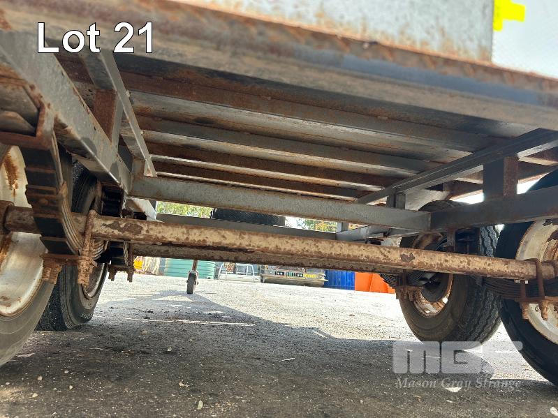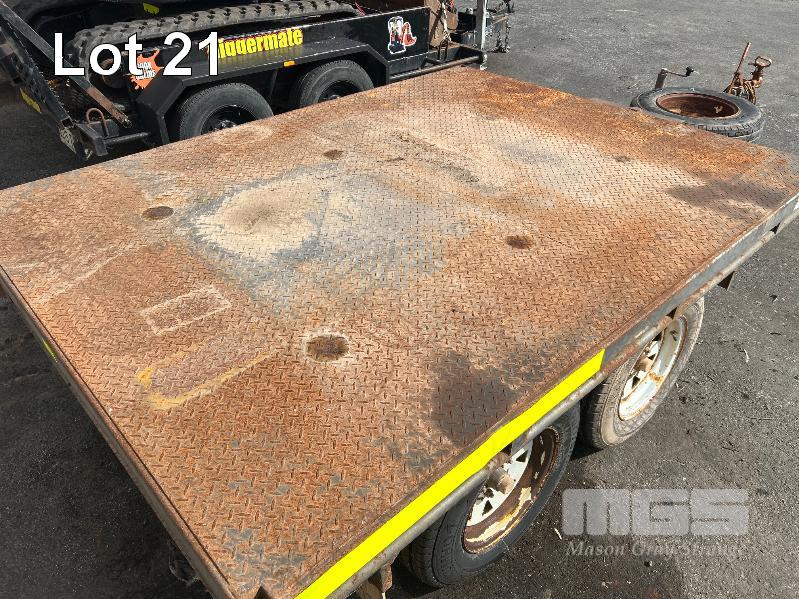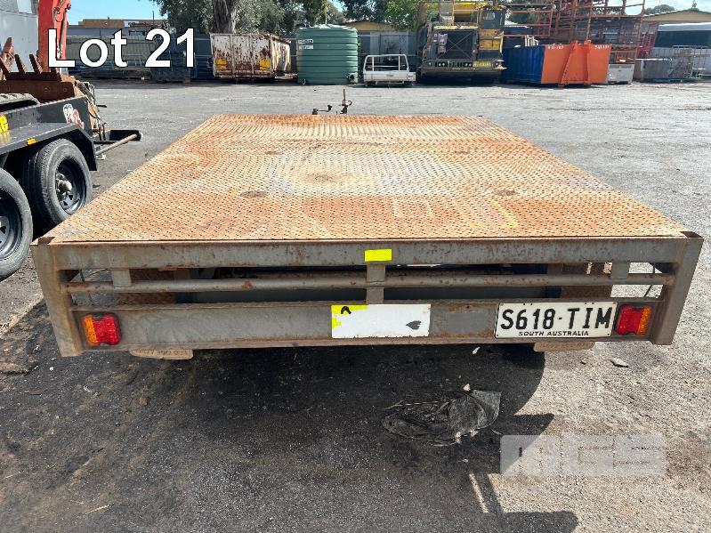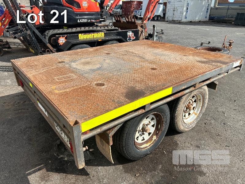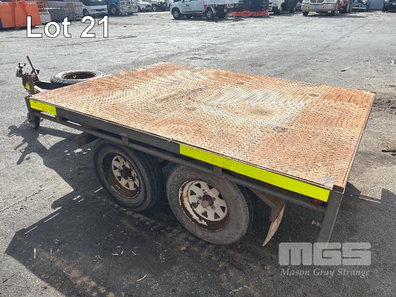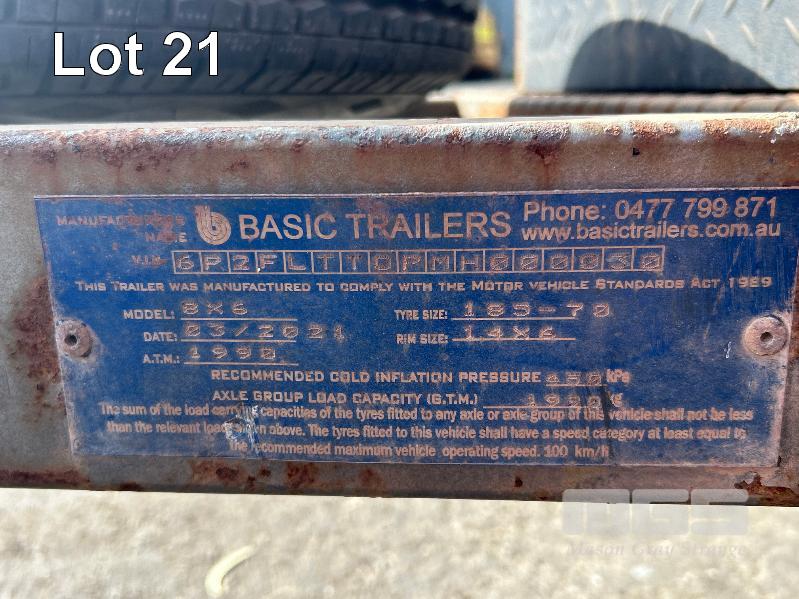 2021 BASIC TRAILERS 8x6' TANDEM AXLE FLAT TOP TRAILER REG: S618 TIM (SA) VIN / CHASSIS: 6P2FLTT0PMH000030 BALL HITCH, JOCKEY WHEEL BRAKES, CHECKER PLATE DECK DECK SIZE : 2410 X 1830mm A-FRAME MOUNT TOOL BOX & SPARE WHEEL TYRE SIZE: 185R14C GTM: 1,990kg (WITH PAPERS)