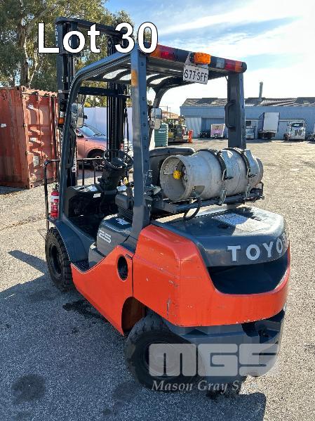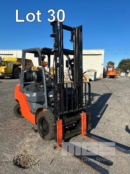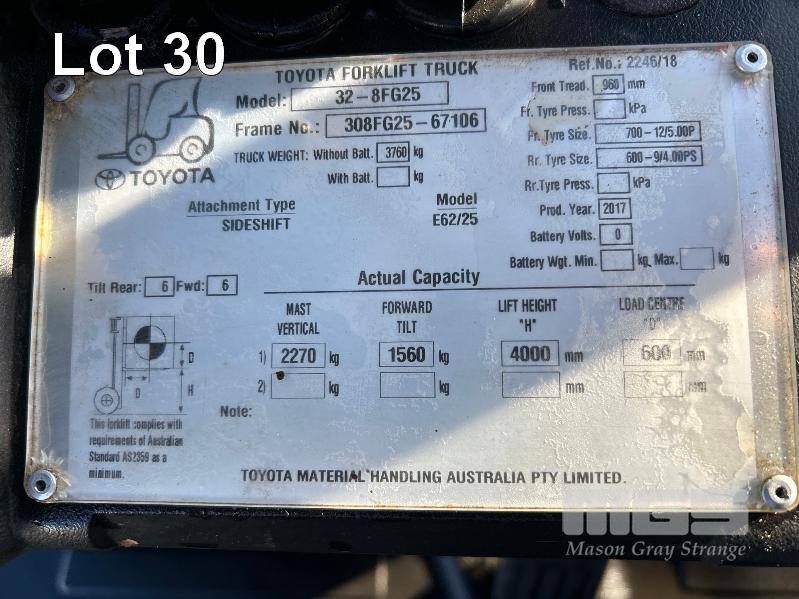 2017 TOYOTA FORKLIFT, MOD: 32-8FG25 S.N: 308FG25-67106 4 CYLINDER DUAL FUEL ENGINE HOURS: 808 SHOWING 2 STAGE CLEAR VEIW MAST, SIDESHIFT OPS SYSTEM, SOLID TYRES, RATED: 2,270kg 2 X KEYS EXCELLENT CONDITION. KEY # 19