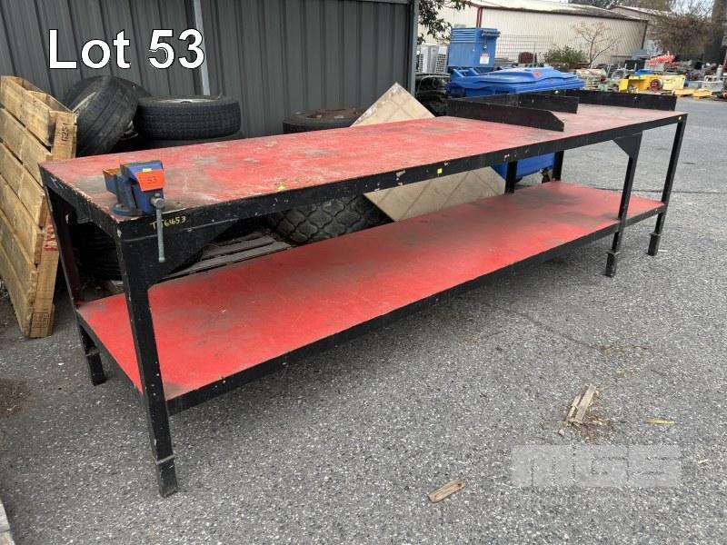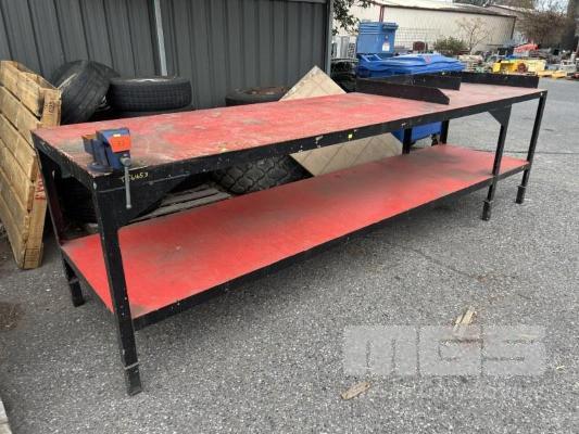 WORKSHOP BENCH, 3650 x 920 x 1000mm (H), PLATE STEEL TOP, STEEL FRAME, 2 TIER WITH 100mm VICE