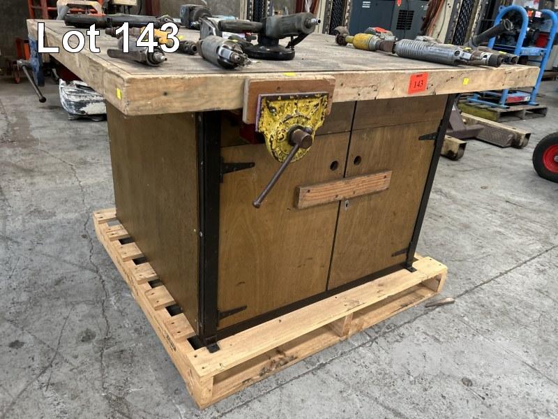 TIMBER WORK BENCH, 1250 x 1400 x 830mm (H), WITH 3 x DAWN VICES, 175mm WITH UNDER BENCH STORAGE