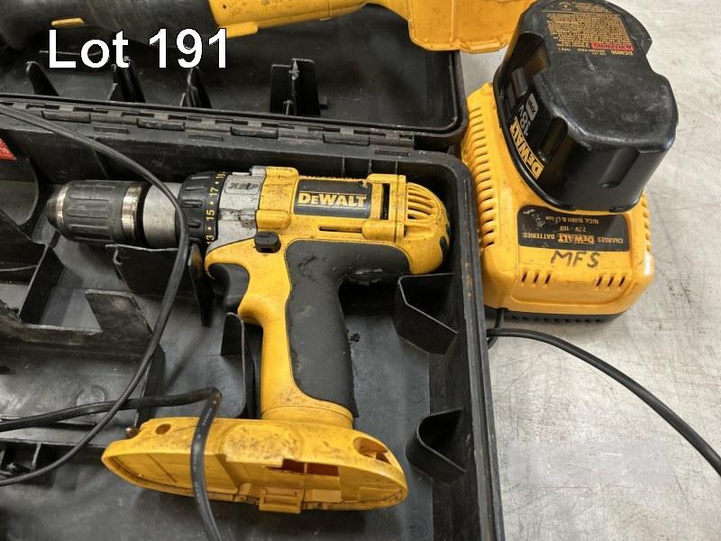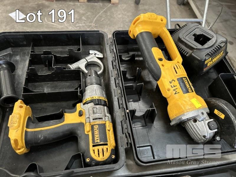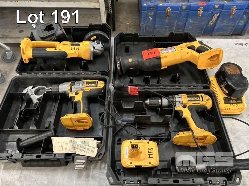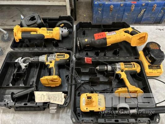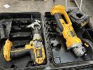 DEWALT POWER TOOLS, CORDLESS INCLUDING 2 x DRILLS, ANGLE GRINDER, RECIPRO SAW, 2 x CHARGERS & 2 x BATTERIES