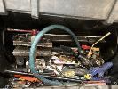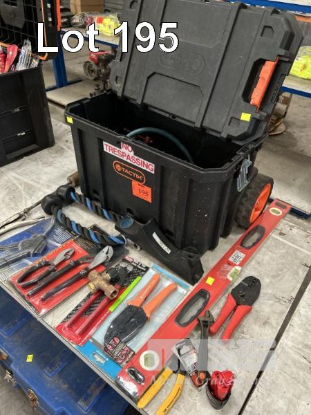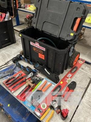 TOOL STORAGE UNIT, TACTIX, MOBILE WITH ASSORTED HAND TOOLS, INCLUDING SPIRIT LEVEL, PLIERS, VICE GRIPS, CRIMPERS, VICE, ETC