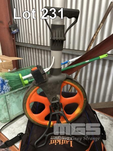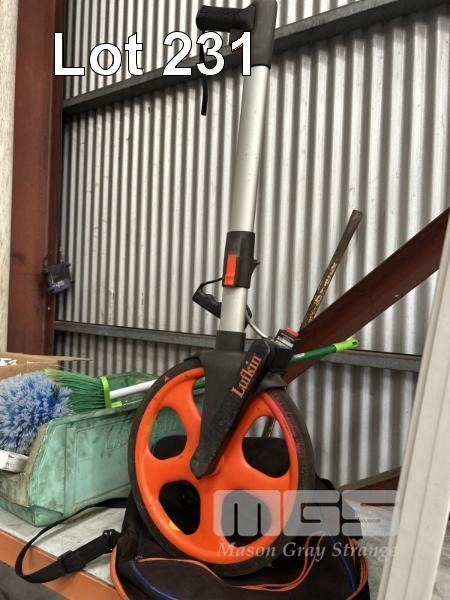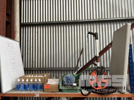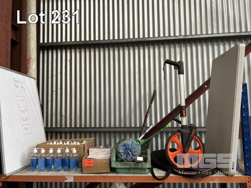 LUFKIN MEASURING WHEEL, WHITEBOARD, 600 x 900mm, 23 x BOTTLES HAND SANITIZER, 500ml, FOLDING TRESTLE TABLE, 100 x 500mm, HARDWARE, STAINLESS STEEL DOOR HANDLES, ETC 1 x SHELF