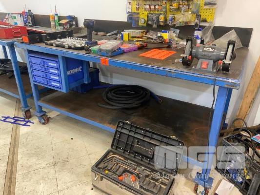 MOBILE WORKBENCH, 4mm STEEL PLATE TOP, 2 TIER, 2000 x 1000mm, UNDER BENCH PULL OUT SMALL COMPONENT STORAGE, WITH OZITO BENCH GRINDER MOUNTED, 240V 10AMP