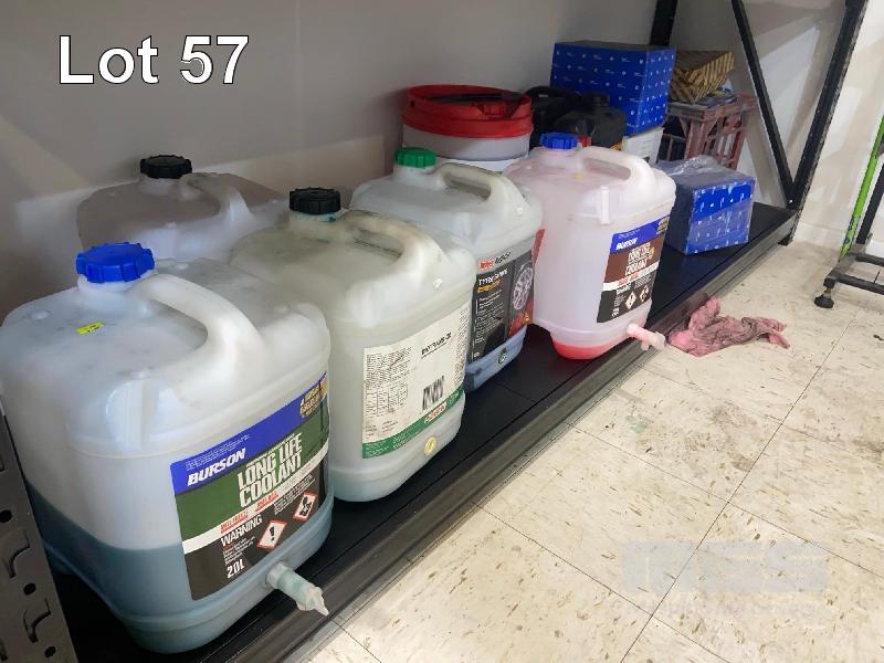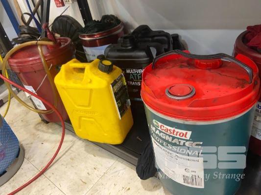 CONTENTS OF 2 x SHELVES, FULL & PART FULL DRUMS ASSORTED OIL, COOLANT & TYRE SHINE