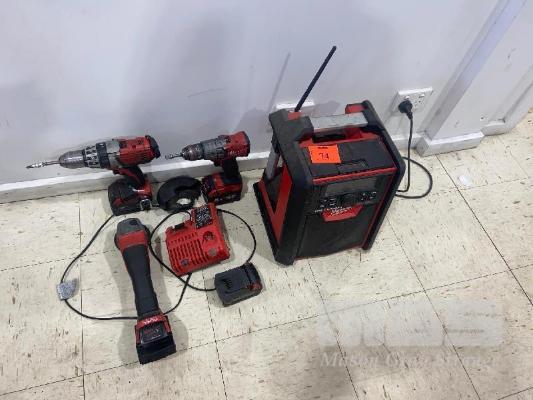 MILWAUKEE 18V TOOL KIT, 2 x DRILLS, ANGLE GRINDER, RADIO, BATTERY CHARGER WITH 3 x 3Ah & 1 x 5Ah