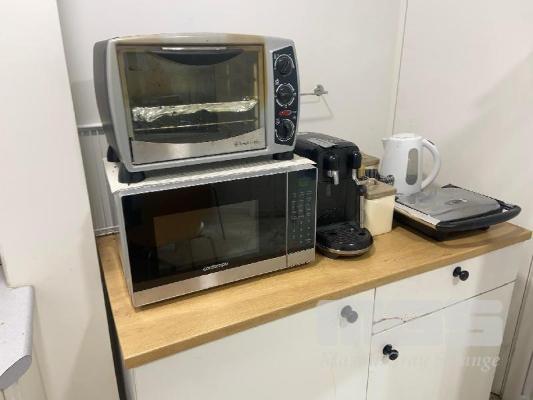 COMPLETE KITCHEN: SIMPSON 2 DOOR FRIDGE FREEZER, SANDWICH PRESS, NESPRESSO POD MACHINE, MICROWAVE, KETTLE, GRILL, KITCHEN TABLE, 1200mm (D) & 4 x CHAIRS