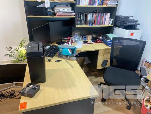 L SHAPE TIMBER DESK WITH RETURN, BOOK SHELF, PAPER SHREDDER, 2 x 22" MONITORS, SAMSUNG CURVED MONITOR, GAS LIFT CHAIR