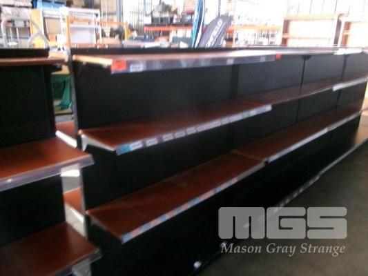 DISPLAY SHELVING, METAL & TIMBER, DOUBLE SIDED, 4 TIER, MOBILE