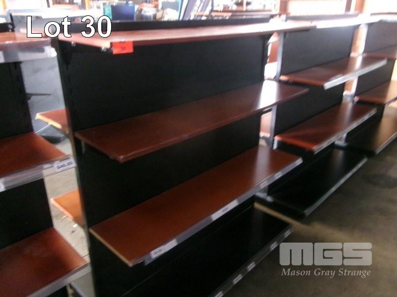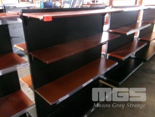 DISPLAY SHELVING, METAL & TIMBER, DOUBLE SIDED, 4 TIER, MOBILE