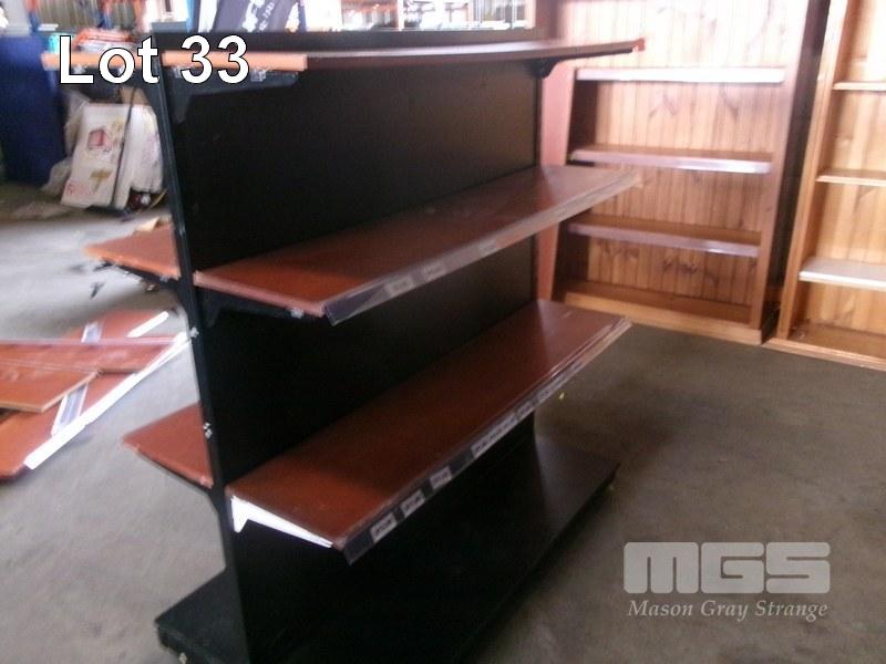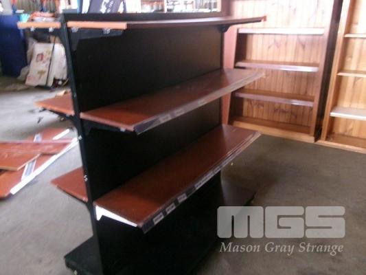 DISPLAY SHELVING, METAL & TIMBER, DOUBLE SIDED, 4 TIER, MOBILE