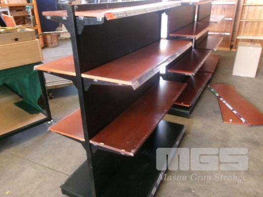 DISPLAY SHELVING, METAL & TIMBER, DOUBLE SIDED, 4 TIER, MOBILE