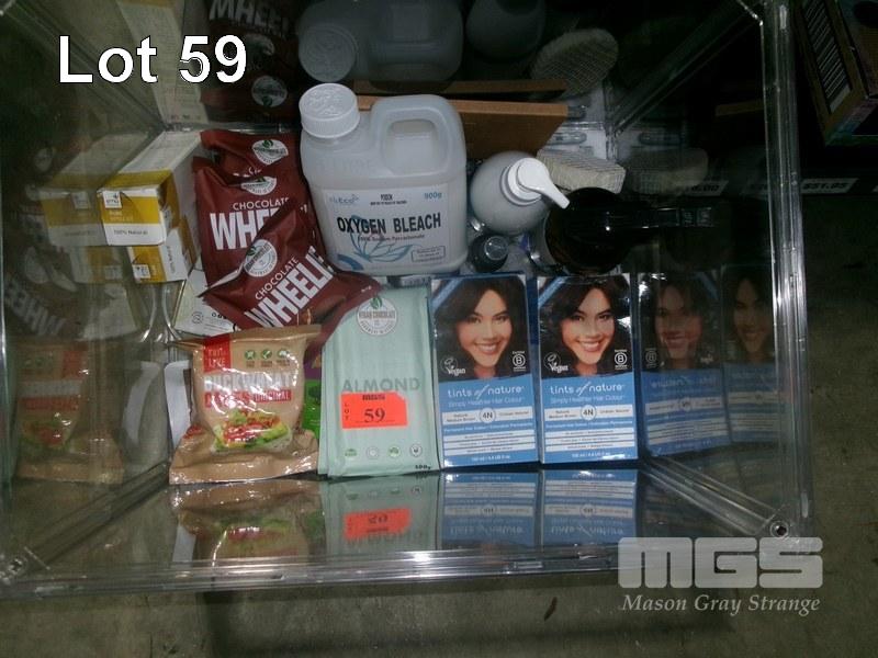 ASSORTED PRODUCTS, VEGAN TINTS OF NATURE, CHOCOLATES, BLEACH, EMU OILS, ETC 1 x PLASTIC CONTAINER