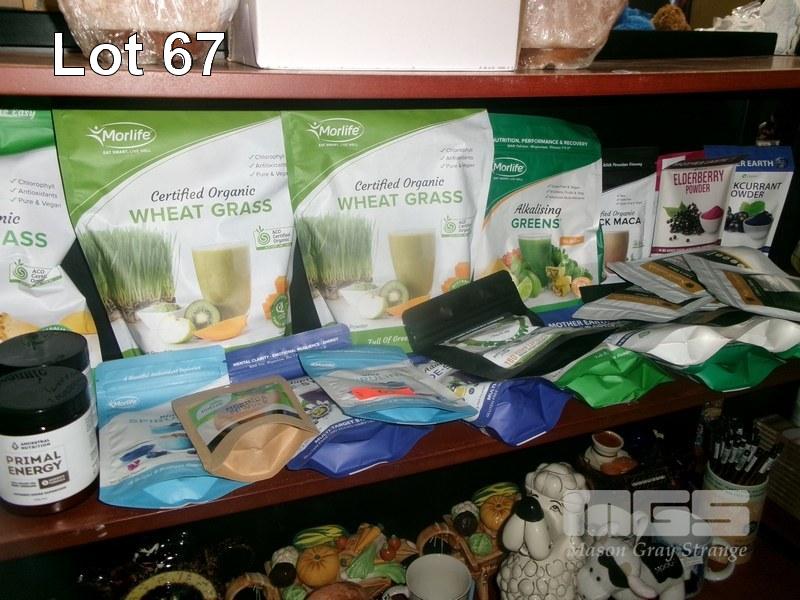28 x ASSORTED PRODUCTS INCLUDING, ORGANIC WHEAT & BARLEY GRASS, PRIMAL ENERGY, MORINGA POWDERS, BLUE SPIRULINA, MUSHROOM EXTRACTS, ETC 1 x SHELF