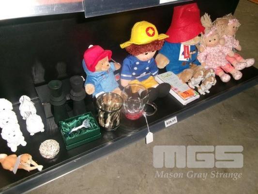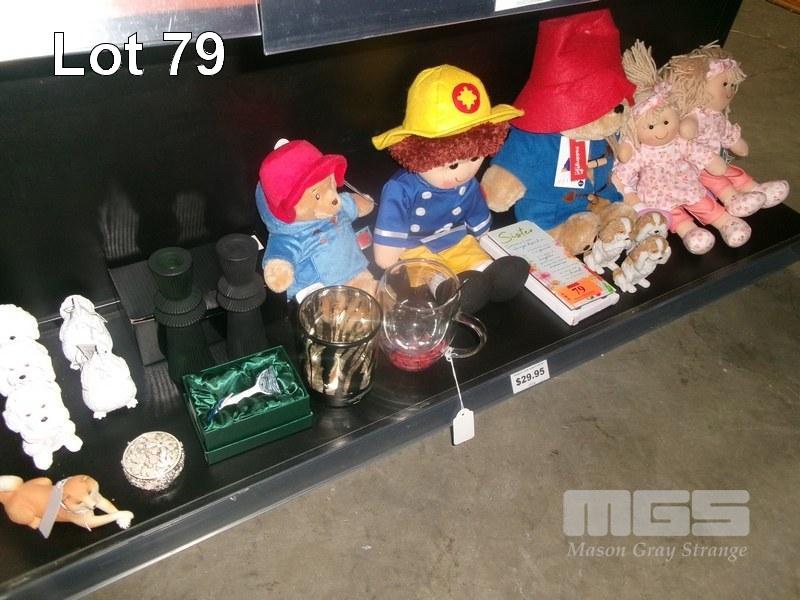 ASSORTED PLUSH TOYS & ORNAMENTS, DOLLS, PADDINGTON BEARS, GLASSWARE, DOGS, CANDLE HOLDERS