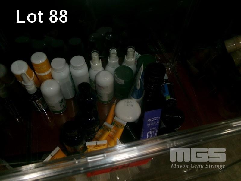 ASSORTED PRODUCTS INCLUDING, TAIL SWAT ROLL ON, SEA MINERALS, BABY POWDER, PERSONAL OUTDOOR SPRAY, HAPPY NAPPY CREAM, HORSE BALM, HERBAL CHEST RUB, ETC 1 x PLASTIC CONTAINER