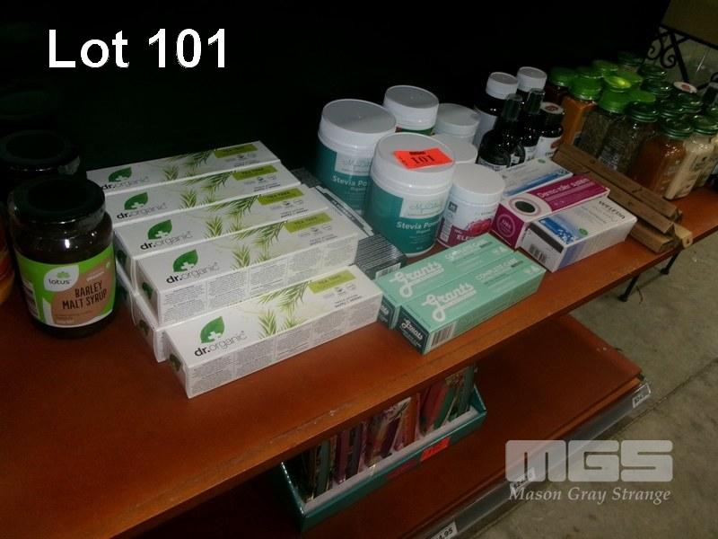 ASSORTED PRODUCTS INCLUDING PAPRIKA, ONION POWDER, GINGER, TAMANU OIL, ELECTROLYTE MIX, STEVIA POWDER, TOOTHBRUSHES, TOOTHPASTES, ORGANIC TURMERIC, BARLEY MALT SYRUP 1 x SHELF