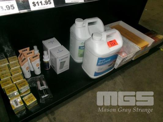 ASSORTED PRODUCTS INCLUDING PAIN RELIEF CREAMS, MOISTURISER, DISH LIQUIDS & 3 x BOXES OF SOAPS, ETC 1 x SHELF