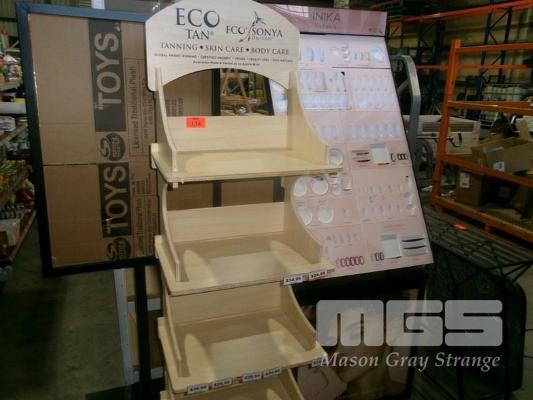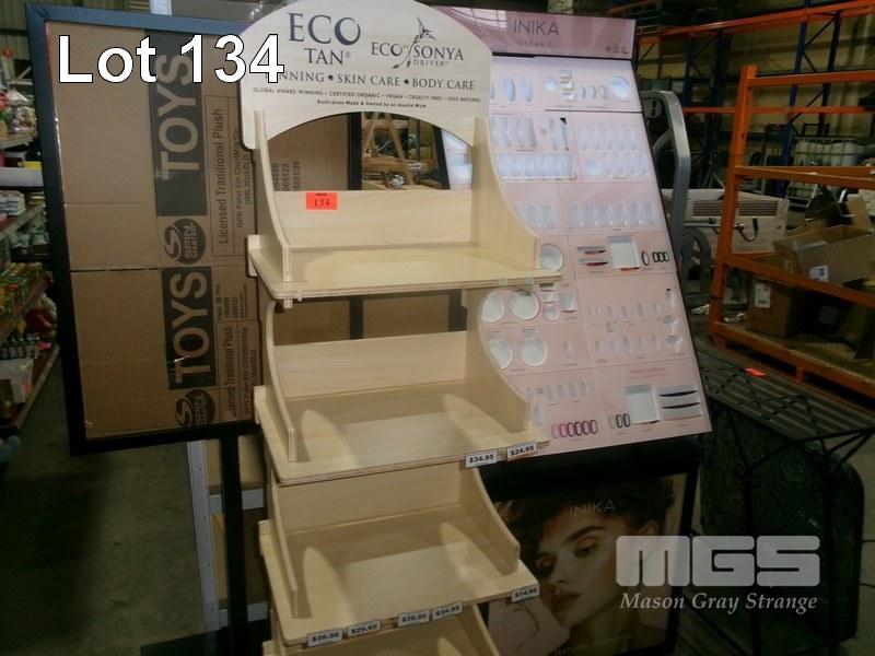 TIMBER DISPLAY STAND, 6 TIER, BLACK METAL SIGNBOARD & MAKEUP DISPLAY STAND