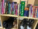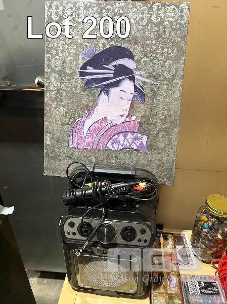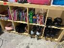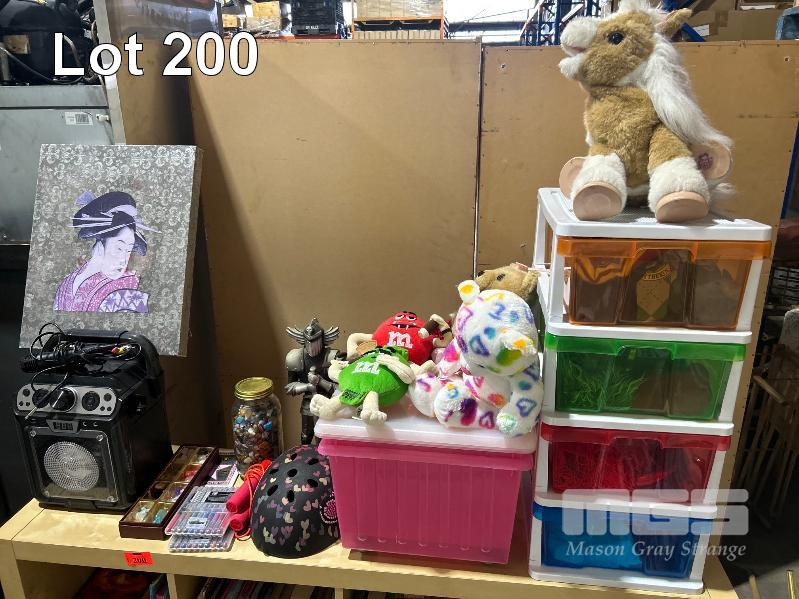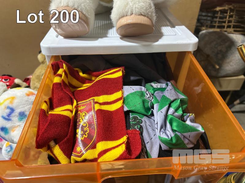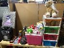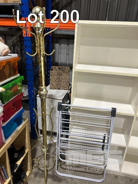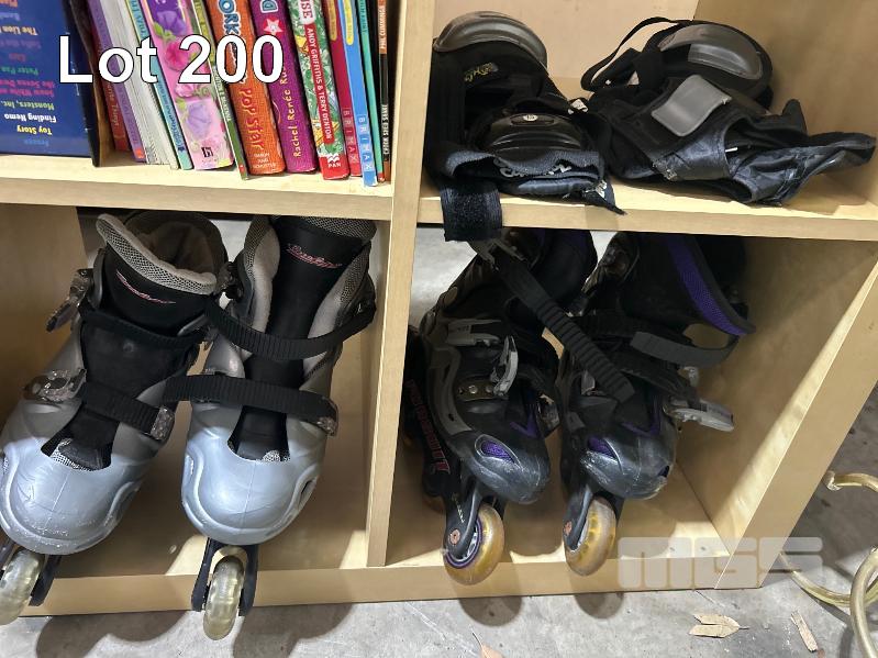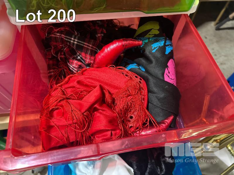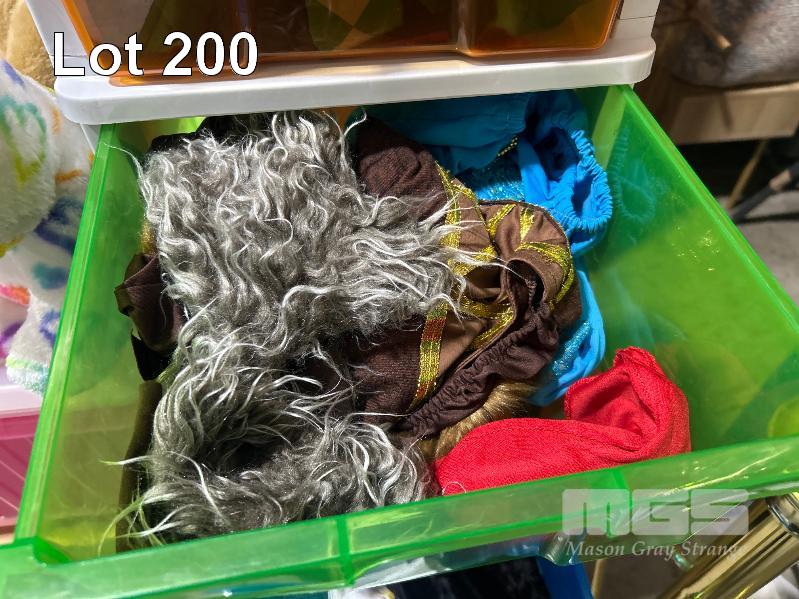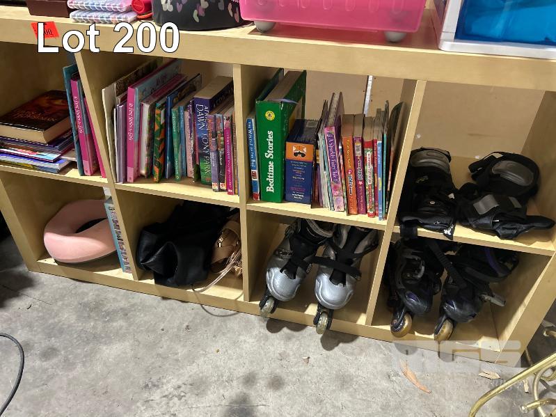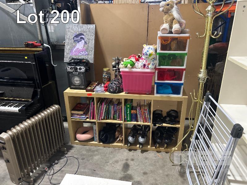 KARAOKE MACHINE, 2 x SETS ROLLER BLADES, KNEE, WRIST & ELBOW PADS, HELMET, SEMI PRESSIOUS STONES IN JAR, FANCY DRESS COSTUMES INC. HARRY POTTER, HALLOWEEN WOLF & WITCH, ETC. ASSORTED CHILDERENS BOOKS, HANDBAGS, OIL HEATER, BRASS HAT STAND, ORIENTAL PICTURE, ETC IN LOWLINE STORAGE UNIT, TIMBER LAMINATE