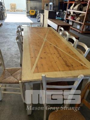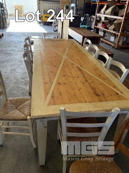 PINE DINING TABLE & 10 CHAIRS WITH WOVEN GRASS SEATS