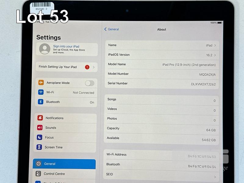 APPLE iPAD PRO 12.9 INCH, 2ND GEN, 64GB, Wi-Fi, SPACE GREY, MODEL MQDA2X/A, A1670 (NO CABLE, NO CHARGER) (NOTE: SCREEN BLEMISHES, MINOR SCRATCHES ON SCREEN) S/N:DLXVM2XTJ262