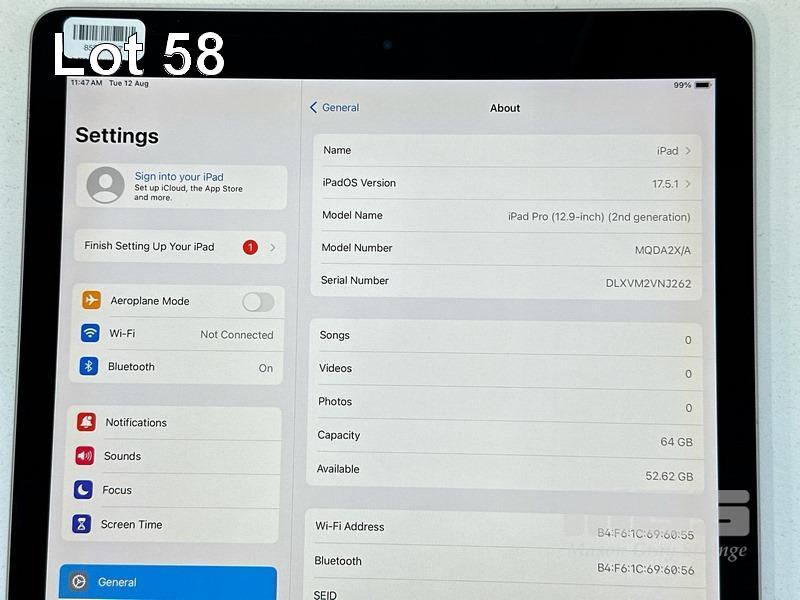 APPLE iPAD PRO 12.9 INCH, 2ND GEN, 64GB, Wi-Fi, SPACE GREY, MODEL MQDA2X/A, A1670 (NO CABLE, NO CHARGER) (NOTE: SCREEN BLEMISHES, MINOR SCRATCHES ON SCREEN) S/N:DLXVM2VNJ262