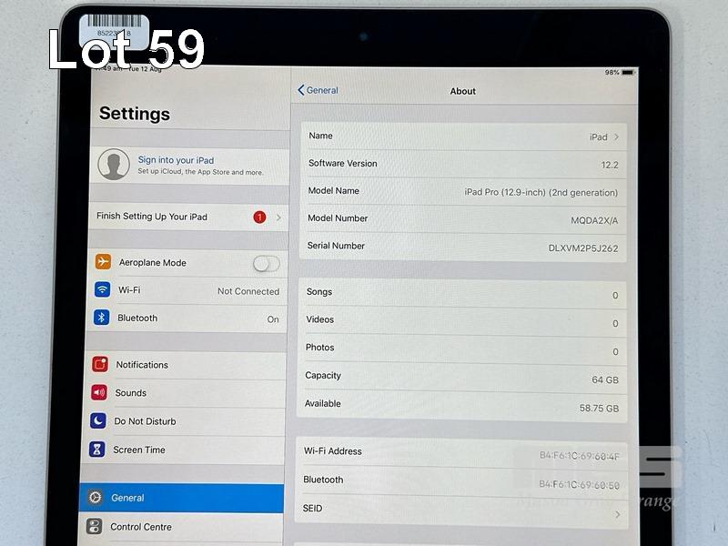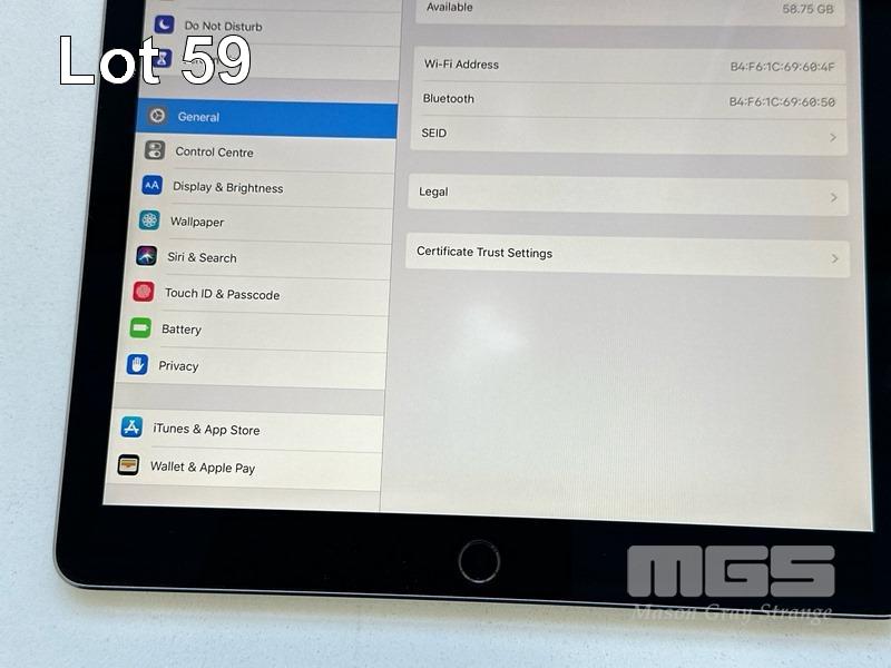 APPLE iPAD PRO 12.9 INCH, 2ND GEN, 64GB, Wi-Fi, SPACE GREY, MODEL MQDA2X/A, A1670 (NO CABLE, NO CHARGER) (NOTE: SCREEN BLEMISHES, MINOR SCRATCHES ON SCREEN) S/N:DLXVM2P5J262