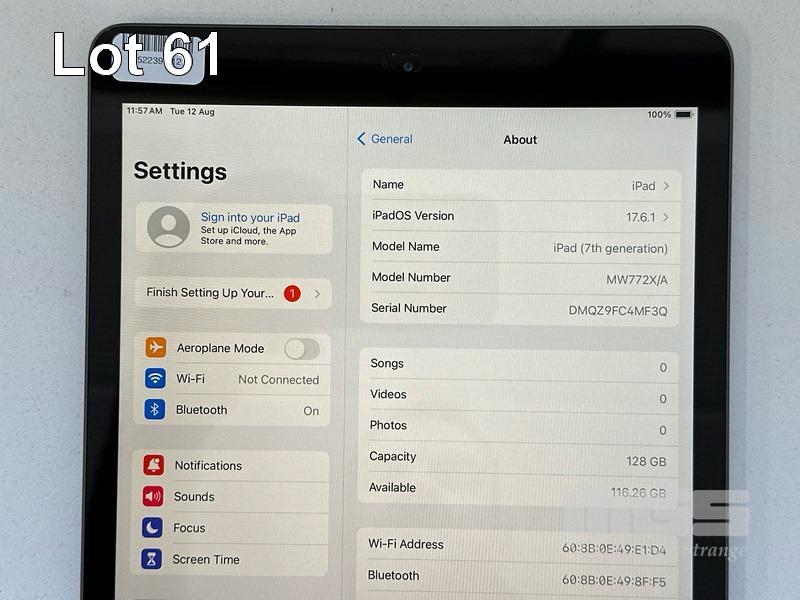 APPLE iPAD 7TH GEN, 128GB, Wi-Fi, SPACE GREY, MODEL MW772X/A, A2197 (NO CABLE, NO CHARGER) S/N:DMQZ9FC4MF3Q