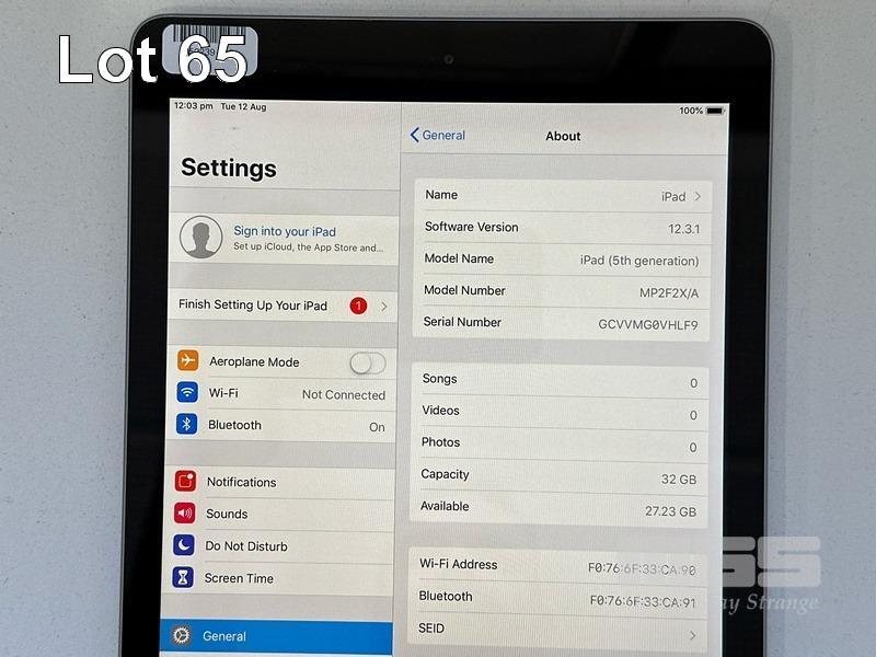 APPLE iPAD 5TH GEN, 32GB, Wi-Fi, SPACE GREY, MODEL MP2F2X/A, A1822 (NO CABLE, NO CHARGER) (NOTE: MINOR SCRATCHES ON SCREEN) S/N:GCVVMG0VHLF9