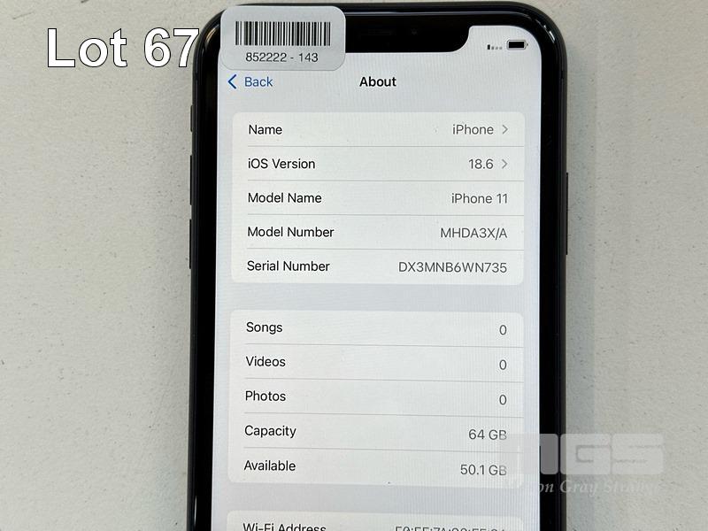 APPLE iPHONE 11, 64GB, MODEL MHDA3X/A, A2221, BLACK, BATTERY HEALTH 99% (NO CABLE, NO CHARGER) (NOTE: MINOR SCRATCHES ON SCREEN) S/N:DX3MNB6WN735