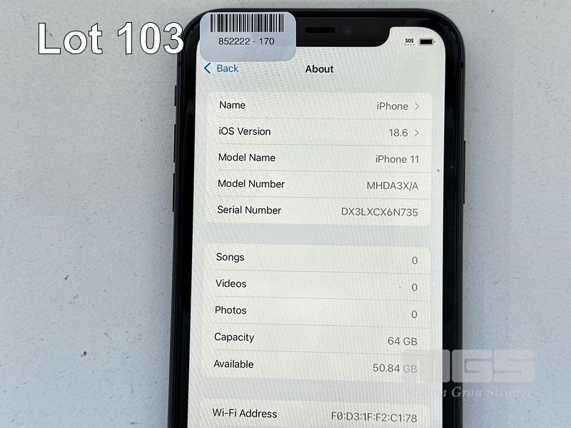 APPLE iPHONE 11, 64GB, MODEL MHDA3X/A, A2221, BLACK, BATTERY HEALTH 100% (NO CABLE, NO CHARGER) (NOTE: SCRATCHES ON SCREEN) S/N:DX3LXCX6N735
