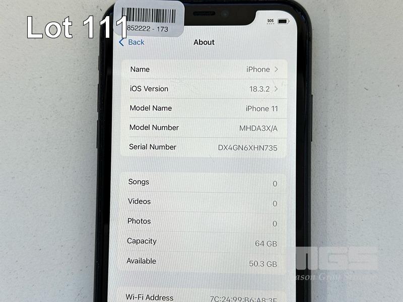 APPLE iPHONE 11, 64GB, MODEL MHDA3X/A, A2221, BLACK, BATTERY HEALTH 80% (NO CABLE, NO CHARGER) (NOTE: SCRATCHES ON SCREEN) S/N:DX4GN6XHN735