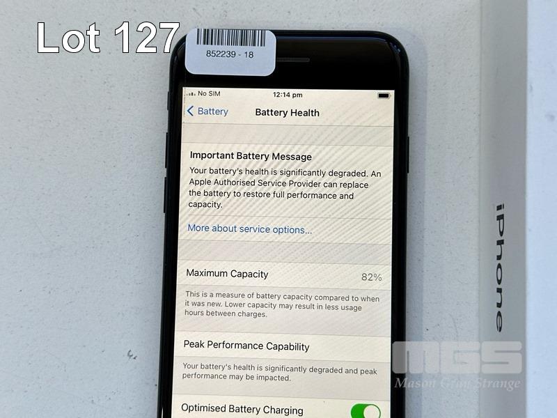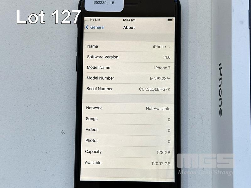 APPLE iPHONE 7, 128GB, BLACK, MODEL MN922X/A, A1778, BATTERY HEALTH 82% (NO CABLE, NO CHARGER) (NOTE: BATTERY SERVICE MESSAGE) S/N:C6KSLQLEHG7K