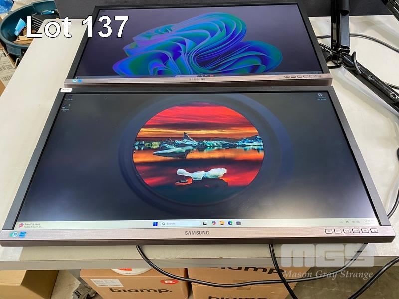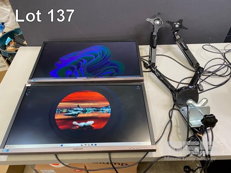 2 x MONITORS, SAMSUNG 28" 4K UHD FREESYNC LED WIDESCREEN, U28E850R, HDMI, DISPLAYPORT (WITH CABLES) WITH DUAL DESK MOUNT MONITOR ARM, BLACK S/N:0MPUHTHG500312R, 0MPUHTHG500315B
