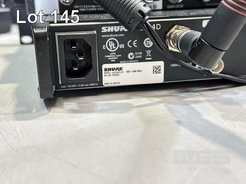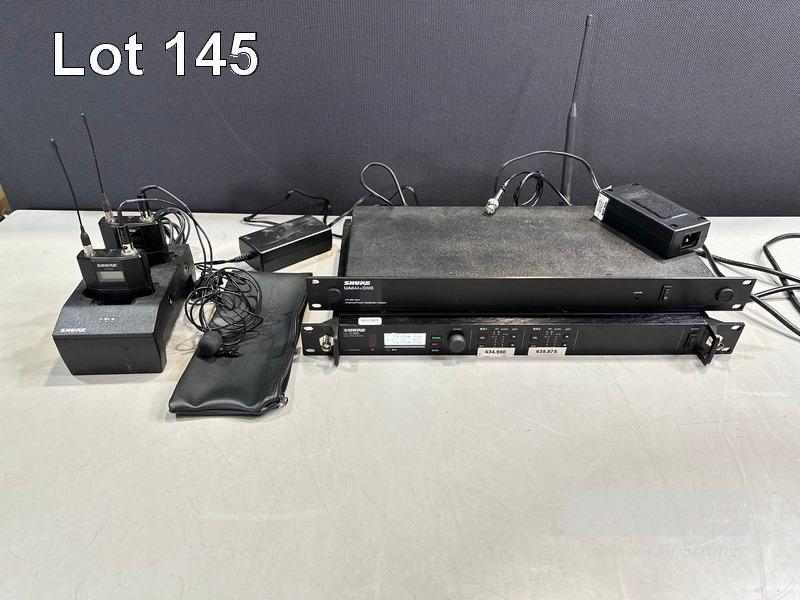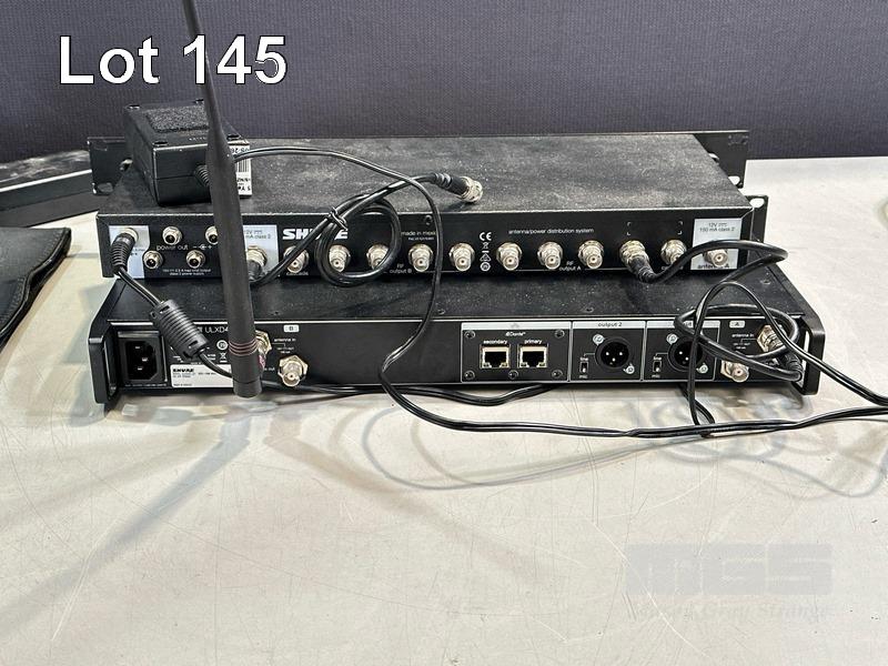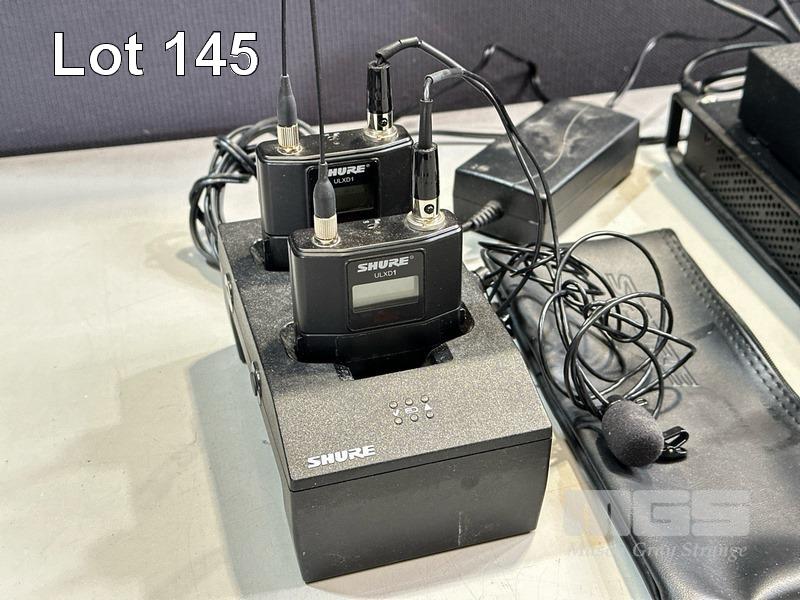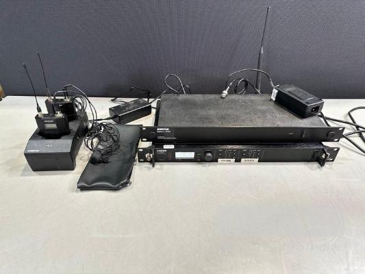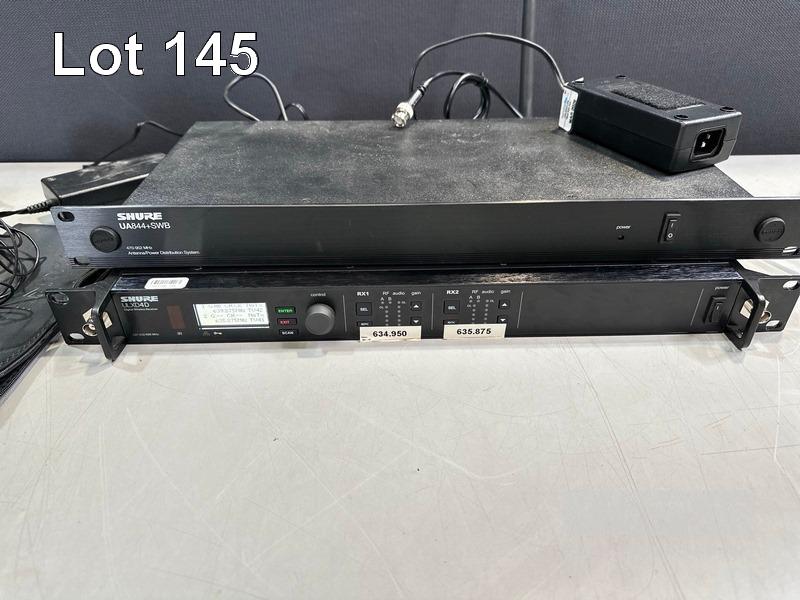 SHURE ULXD4D DUAL CHANNEL DIGITAL WIRELESS RECEIVER, L51 632-606MHz, SHURE UA844+SWB ANTENNA/POWER DISTRIBUTION SYSTEM, 470-952MHz 2 x SHURE ULXD1 BODYPACKS WITH LAPEL MICROPHONES, 1 x DUAL DESKTOP CHARGER WITH POWER SUPPLY