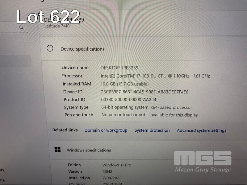 LAPTOP, DELL LATITUDE 7410, CORE i7 10810U (10TH GEN) @ 1.1GHz, 16GB DDR4 RAM, 512GB NVMe M.2 SSD, 14" WIDESCREEN (1920x1080), INTEL UHD GRAPHICS, Wi-Fi, BLUETOOTH, WINDOWS 11 PRO INSTALLED (NO USB-C POWER SUPPLY) (NOTE: SOME KEYBOARD KEYS WORN, BATTERY NOT HOLDING CHARGE, RUBBER PAD MISSING ON BOTTOM OF LAPTOP) S/N:23S5BC3
