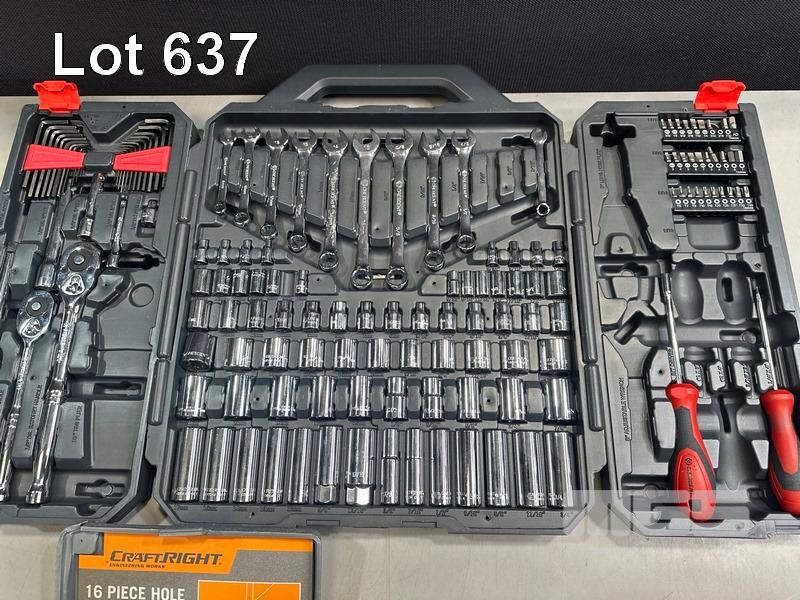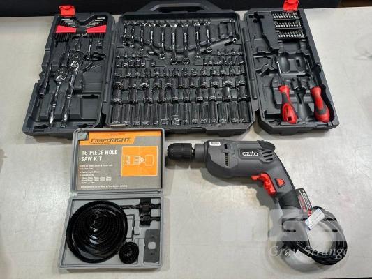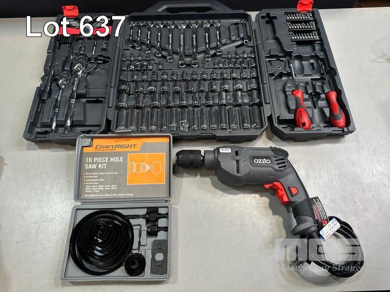 OZITO HDR-3000 HAMMER DRILL, OZITO HGN-2100 HEAT GUN & CASE, CRESCENT 170-PIECE MECHANICS TOOL SET (SOME MISSING), CRAFTRIGHT 16 PIECE HOLD SAW KIT, 2 x ORGANIZERS
