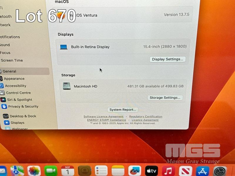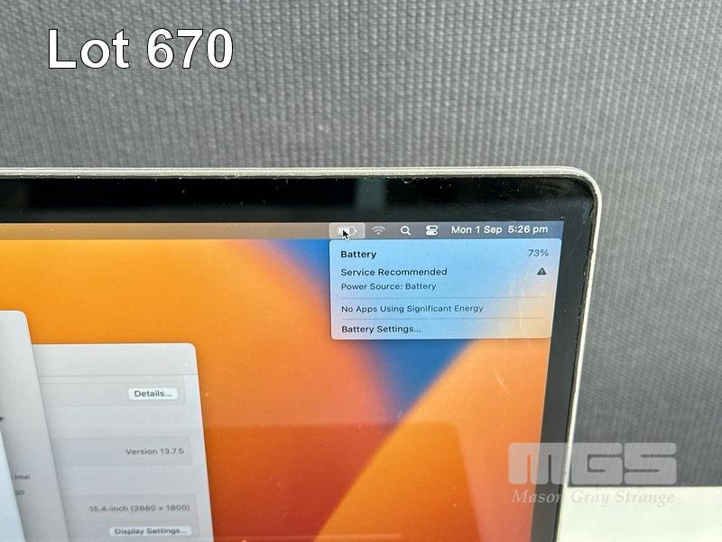 LAPTOP, APPLE MACBOOK PRO (A1707), CORE i7 7820HQ (7TH GEN) @ 2.9GHz, 16GB DDR3 RAM, 512GB SSD, 15.4" RETINA DISPLAY (2880x1800), INTEL HD GRAPHICS 630, 4GB RADEON PRO 560 VIDEO, Wi-Fi, BLUETOOTH, MAC OS 13 INSTALLED & USB-C POWER SUPPLY (NOTE: BATTERY SERVICE RECOMMENDED MESSAGE, MARKS ON SCREEN) S/N:C02V3BX4HTD6