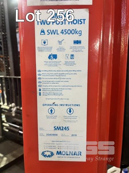 2019 2 POST HOIST, MOLNAR SWL: 4500kg S/NO: 2G4D5958 415V, 3 PHASE POWER PLUGGED