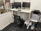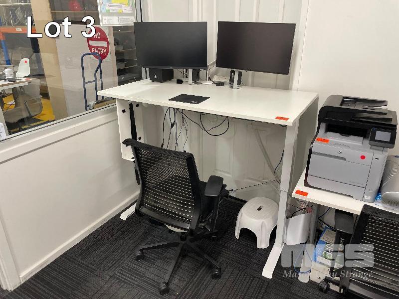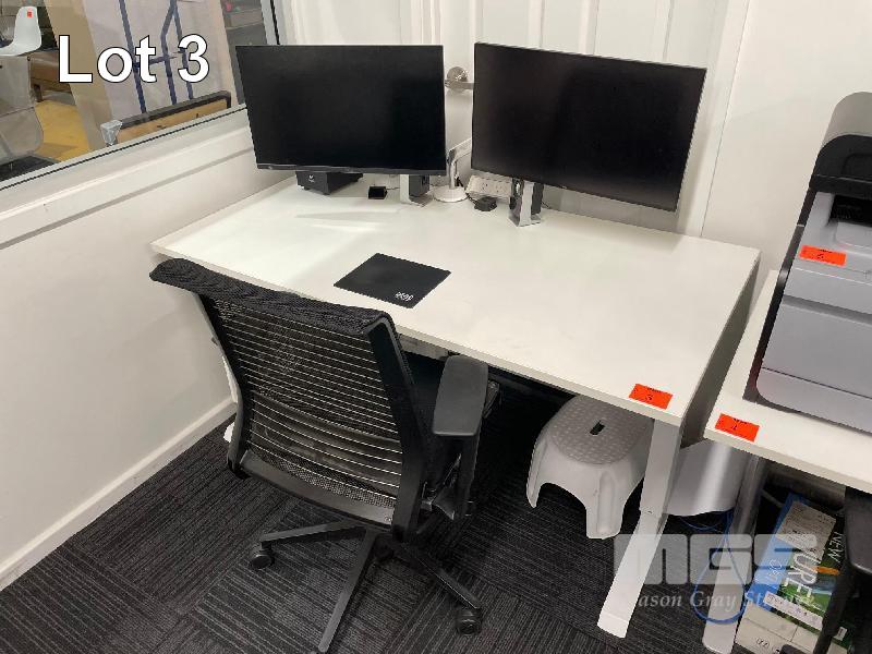 ELECTRIC RISE & FALL DESK WHITE TIMBER LAMINATE, 1500 x 750mm, WHITE STEEL FRAME, WITH PAIR DELL 25" MOUNTED MONITORS, 240V 10AMP & GAS LIFT CHAIR, BLACK FABRIC WITH LOGITECH SPEAKERS