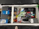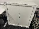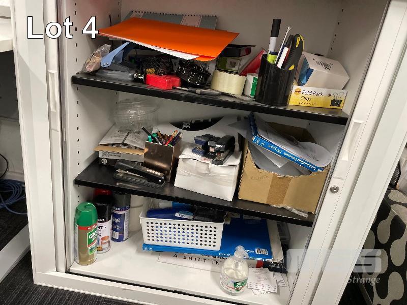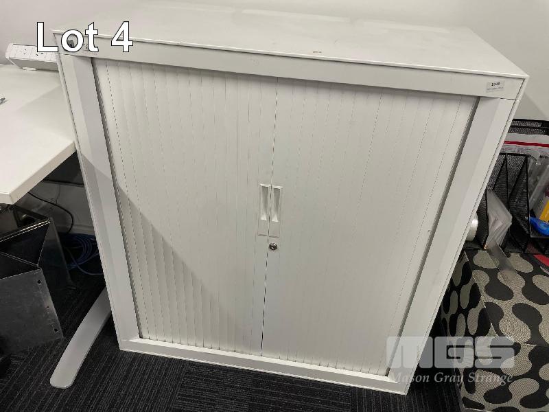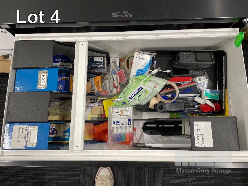 WHITE TIMBER LAMINATE DESK, GREY STEEL FRAME, 1200 x 700mm BLACK STEEL 2 DRAWER CABINET, 1000 x 500 x 500mm WITH GAS LIFT CHAIR, BLACK FABRIC & WHITE TAMBOUR STATIONARY CABINET INCLUDING QTY ASSORTED OFFICE STATIONARY