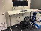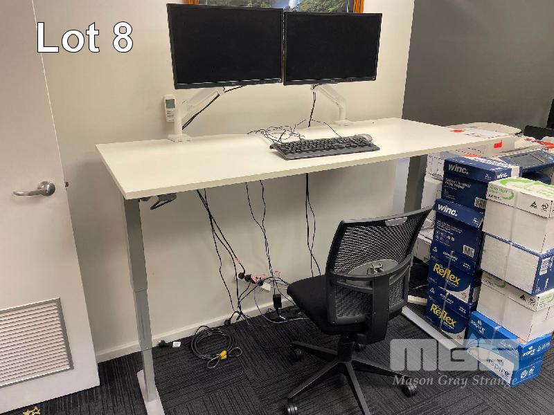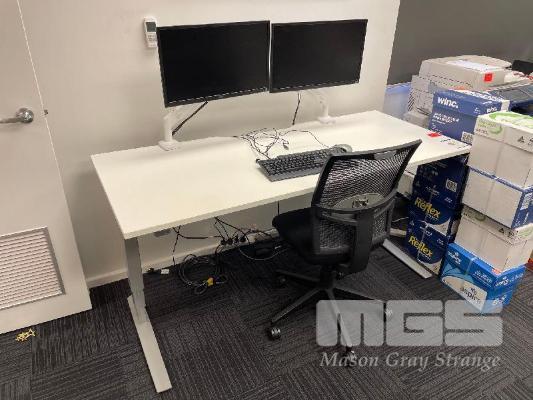 ELECTRIC RISE & FALL DESK, WHITE TIMBER LAMINATE, 1800 x 750mm WITH 2 x LG 24" MOUNTED MONITORS, BLACK FABRIC GAS LIFT CHAIR, TAMBOUR STORAGE CABINET, 900 x 500 x 950mm