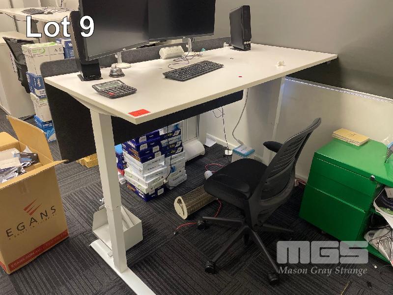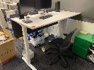 ELECTRIC RISE & FALL DESK, WHITE TIMBER LAMINATE, 1800 x 800mm WITH 2 x DELL 25" MOUNTED MONITORS, BLACK FABRIC GAS LIFT CHAIR, PAIR CREATIVE SPEAKERS, GREEN STEEL STORAGE UNIT, 900 x 500mm