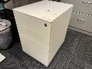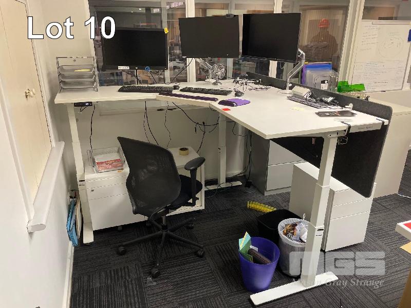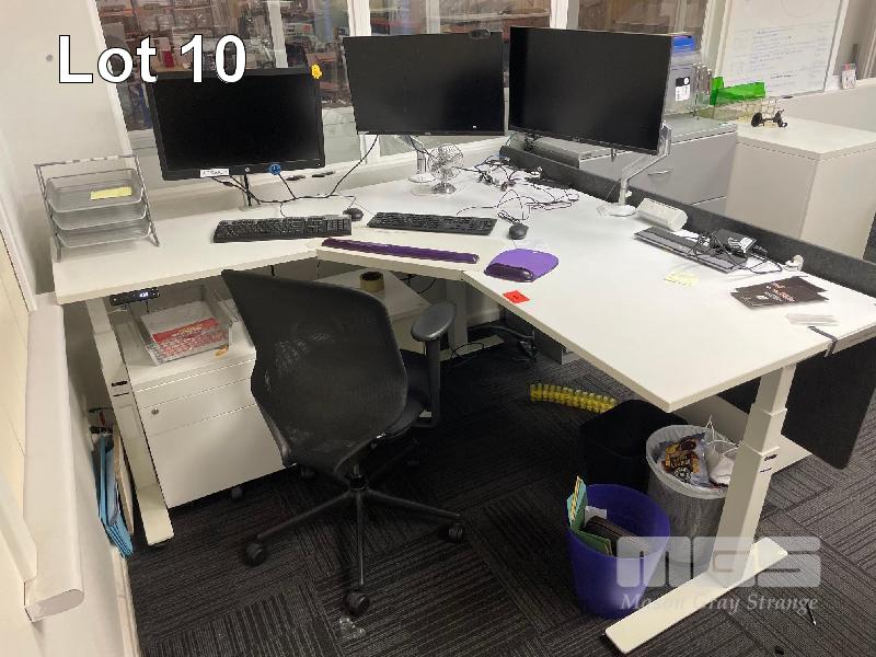 ELECTRIC RISE & FALL CORNER DESK, WHITE TIMBER LAMINATE, 1800 x 1800mm WITH 2 x DELL 25" MOUNTED MONITORS, 1 x HP 24" MONITORS, 3 DRAWER UNDER DESK MOBILE, BLACK FABRIC GAS LIFT CHAIR, WHITE STEEL STORAGE CABINET, 1050 x 460mm